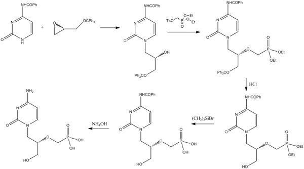 Cidofovir can be synthesized from a pyrimidone derivative and a protected derivative of glycidol.[25]