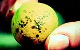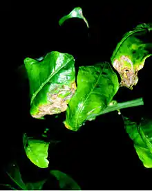 Xanthomonas axonopodis pv. citri overseason in an infected area which appears as a canker lesion on leaf or stem. The bacteria ooze out of the lesions when there is free moisture. During rainy weather, wind-blown rain carries the inoculum to new susceptible hosts. The bacteria infect new plants through stomata and wounds. Pruning or hedging can cut open mesophyll tissues, creating wounds through which the plant may be directly infected. The rain can also cause water congestion on the leaf surface, form columns of water through the stomata and promote infection through natural openings. Infections can form on fruit, foliage and young stem. Leaves and stems are most susceptible to infection within the first six weeks of initial growth. Infection of fruit is most likely to occur during the 90 day period after petal fall during fruit formation.[4] The varied size of lesions on citrus fruit is because of the multiple cycle of infections and can reflect different-aged lesions on the same fruit.[5][6]