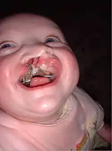 Cleft lip and cleft palate, also known as orofacial cleft, is a group of conditions that includes cleft lip, cleft palate, and both together.[1][2] A cleft lip contains an opening in the upper lip that may extend into the nose.[1] The opening may be on one side, both sides, or in the middle.[1] A cleft palate occurs when the roof of the mouth contains an opening into the nose.[1] These disorders can result in feeding problems, speech problems, hearing problems, and frequent ear infections.[1] Less than half the time the condition is associated with other disorders.[1]