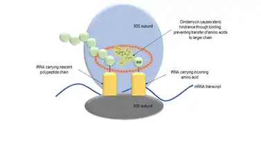 Clindamycin has a primarily bacteriostatic effect. At higher concentrations, it may be bactericidal.[54] It is a bacterial protein synthesis inhibitor by inhibiting ribosomal translocation,[55] in a similar way to macrolides. It does so by binding to the 50S rRNA of the large bacterial ribosome subunit, overlapping with the binding sites of the oxazolidinone, pleuromutilin, and macrolide antibiotics, among others.[18][56] The binding is reversible.[57] Clindamycin is more effective than lincomycin.[54]