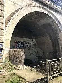 From other writings and from the path that it takes, it may have started life as an open drain, formed from streams from three of the neighbouring hills, that were channelled through the main Forum and then on to the Tiber.[2] This open drain would then have been gradually built over, as building space within the city became more valuable. It is possible that both theories are correct, and certainly some of the main lower parts of the system suggest that they would have been below ground level even at the time of the supposed construction. Pliny the Elder, writing in the late 1st century, describes the early Cloaca Maxima as "large enough to allow the passage of a wagon loaded with hay".[5]