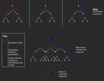 Clonality implies the state of a cell or a substance being derived from one source or the other. Thus there are terms like polyclonal—derived from many clones; oligoclonal[2]—derived from a few clones; and monoclonal—derived from one clone. These terms are most commonly used in context of antibodies or immunocytes.