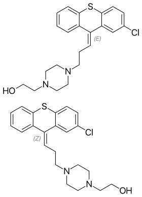 Clopenthixol is a mixture of cis and trans isomers. Zuclopenthixol, the pure cis isomer, was later introduced by Lundbeck in 1962,[2] and has been much more widely used. Both drugs are equally effective as antipsychotics and have similar adverse effect profiles, but clopenthixol is half as active on a milligram-to-milligram basis and appears to produce more sedation in comparison.[3]