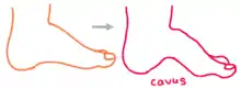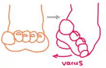 Varus: the heel is inverted, or turned in, forcing one to walk on the outside of the foot. This is a natural motion but in clubfoot the foot is fixed in this position. |