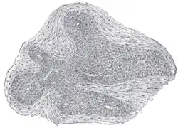 ![]() Section of an irregular nodule of the glomus coccygeum. X 85. The section shows the fibrous covering of the nodule, the bloodvessels within it, and the epithelial cells of which it is constituted. | |