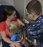 A baby's immune system is not yet fully developed. Babies are more likely to have serious complications or die from diseases, even diseases that have milder effects in adults.[3][5] A baby can use some antibodies from the mother, transmitted in the womb. For this reason, it is recommended that people who are expecting to become pregnant get some vaccines, and those who are pregnant get others.[6][3][5] However, this maternal protection wears off after a few months.[3][5] Breastfeeding also offers protection, but is not as effective as vaccination at preventing some diseases.[3]