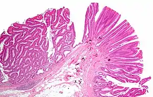 | Tubulovillous adenoma (tubular component – left of image, villous component – right of image). H&E stain. | |