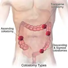 Placement of the stoma on the abdomen can occur at any location along the colon, but the most common placement is on the lower left side near the sigmoid where a majority of colon cancers occur. Other locations include the ascending, transverse, and descending sections of the colon.[5]