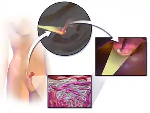 Colposcopy (Ancient Greek: κόλπος, romanized: kolpos, lit. 'hollow, womb, vagina' + skopos "look at") is a medical diagnostic procedure to examine an illuminated, magnified view of the cervix as well as the vagina and vulva.[1] Many pre-malignant lesions and malignant lesions in these areas have discernible characteristics that can be detected through the examination. It is done using a colposcope, which provides a magnified view of the areas, allowing the colposcopist to visually distinguish normal from abnormal appearing tissue and take directed biopsies for further pathological examination. The main goal of colposcopy is to prevent cervical cancer by detecting and treating precancerous lesions early. The procedure was developed by the German physician Hans Hinselmann, with help from Eduard Wirths.[2][3] The development of colposcopy involved experimentation on Jewish inmates from Auschwitz.[4]