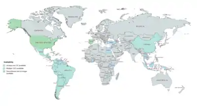 CICs are available in many countries throughout the world, including widely throughout Central and South America, in Mexico and the Caribbean, in China, in several Southeast Asian and African countries, and in Turkey.[21][22][23][13][2][14][15][16][17] They were also previously available in the United States, Portugal, and Spain, but have been discontinued in these countries.[22][23]