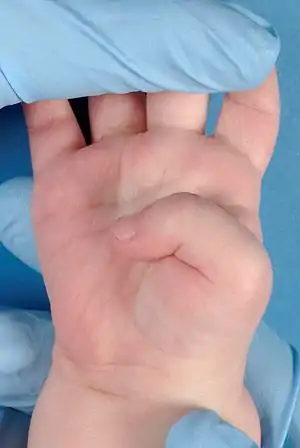 Congenital clasped thumb describes an anomaly which is characterized by a fixed thumb into the palm at the metacarpophalangeal joint in one or both hands.[5] The incidence and genetic background are unknown. A study of Weckesser et al. showed that boys are twice as often affected with congenital clasped thumb compared to girls. The anomaly is in most cases bilateral (present in both hands).[5] A congenital clasped thumb can be an isolated anomaly, but can also be attributed to several syndromes.