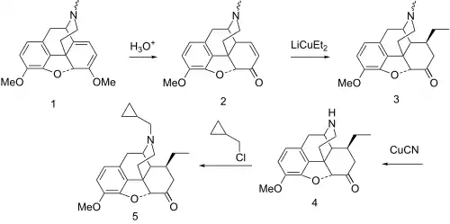 Exposure of thebaine (1) to mild acid leads to hydrolysis of the enol ether function followed by migration of the double bond to yield the conjugated enone (2). Addition of lithium diethylcuprate proceeds by 1,4-addition from the less hindered side to give the intermediate 3. Treatment of that with cyanogen bromide under von Braun reaction conditions leads to the isolable aminocyanide. This is the converted to the secondary amine (4) by treatment with aqueous base. Alkylation of that intermediate with cyclopropylmethyl chloride[4][5] affords the analgesic codorphone (5).