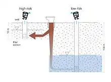 Liquids leach from the pit and pass the unsaturated soil zone (which is not completely filled with water). Subsequently, these liquids from the pit enter the groundwater where they may lead to groundwater pollution. This is a problem if a nearby water well is used to supply groundwater for drinking water purposes. During the passage in the soil, pathogens can die off or be adsorbed significantly, mostly depending on the travel time between the pit and the well.[25] Most, but not all pathogens die within 50 days of travel through the subsurface.[26]