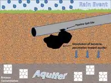 Oil spills associated with underground pipelines and tanks can release benzene and other soluble petroleum hydrocarbons that rapidly percolate down into the aquifer.