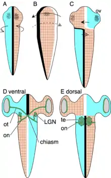 According to current understanding, the contralateral organization is due to an axial twist (explained further below), which is the only theory that has been tested independently.[4] A number of alternative proposals were published earlier,[5] the most popular of which is the visual map theory. A popular-science video explains these theories in brief.[6]