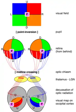 Cajal's schema of the visual map theory. O=Optic chiasm; C=Visual (and motor) cortex; M, S=Decussating pathways; R, G: Sensory nerves, motor ganglia.Transformations of the visual field toward the visual map on the primary visual cortex. U=up; D=down; L=left; R=right; F=foveaThe visual map theory was published by the famous neuroscientist and pioneer Santiago Ramón y Cajal (1898).[7] (See also [8] and [5] for English summaries.) According to this theory, the function of the optic chiasm is to repair the retinal field image on the visual cortex. The pupil in the vertebrates’ eyes inverts the image on the retina, so that the visual periphery projects to the medial side of the retina. By the chiasmatic crossing, the visual periphery is again on the outside, if one assumes that the retinal map is faithfully maintained throughout the optic tract.
