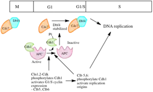 A two-step mechanism ensures that DNA is replicated only once per cycle. Assembly of the pre-RC complex (licensing) is limited to late mitosis and early G1 because it can occur only when CDK activity is low, and APC activity is high. Origin firing occurs only in S phase, when the APC is inactivated, and CDKs are activated.[1]