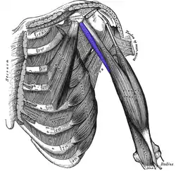 Deep muscles of the chest and front of the arm, with the boundaries of the axilla. Coracobrachialis is shown in blue.