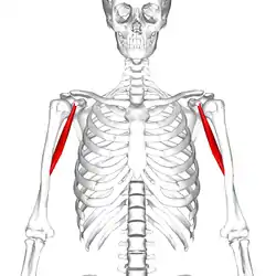 The action of the coracobrachialis is to flex and adduct the arm at the glenohumeral joint (shoulder joint). Also, the coracobrachialis resists deviation of the arm from the frontal plane during abduction.[2] Therefore, the contraction of the coracobrachialis leads to two distinct movements at the shoulder joint. It both draws the humerus forward, causing flexion of the arm, and draws the humerus toward the torso, causing adduction of the arm. To a smaller extent, it also turns the humerus inwards, causing internal rotation.[3] Another important function of the coracobrachialis is the stabilization of the humeral head within the shoulder joint, especially when the arm is hanging freely at a person's side.[3]