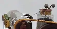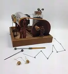 The crank wheel is turned by an operator using the knob handle and then the glass cylinder would rotate by an attached belt. The glass jar then rubs against a layered silk cloth pad or a textile cloth pad, developing a high-voltage positive electrical charge. This static electricity charge is then taken off the glass cylinder through a small metal rake and transferred by wire to the Leyden jar storage battery for later use (see close-up illustration).[3] The high voltage stored electrostatic charge kept in the Leyden jar was then on the metal ball on top of the glass storage battery. It would produce a spark visible to the eye when the set of small metal globes attached to the battery were brought close enough to each other as a test experiment in a discharge.[4] The electrical principles of Corbett's electrostatic machine were later used by Edison.[4][5][6]