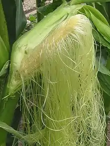 Corn silk is a common name for Stigma maydis, the shiny, thread-like, weak fibers that grow as part of ears of corn (maize); the tuft or tassel of silky fibers that protrude from the tip of the ear of corn. The ear is enclosed in modified leaves called husks. Each individual fiber is an elongated style, attached to an individual ovary.[1] The term probably originated somewhere between 1850 and 1855.[1]