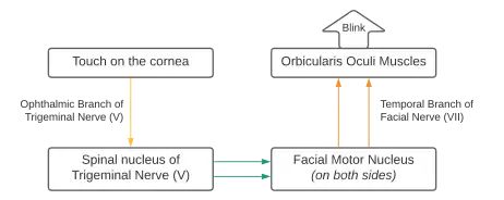 - the nasociliary branch of the ophthalmic branch (V1) of the trigeminal nerve (CN V) sensing the stimulus on the cornea only (afferent fiber).