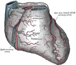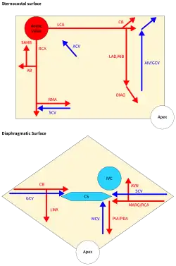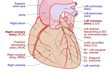 ![]() Coronary arteries labeled in red text and other landmarks in blue text. | |