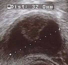 | Corpus luteum cyst with bleeding. Fresh blood is anechoic (black). A protrusion of coagulated blood (lighter in color) can also be seen in the top of the cyst. | |
