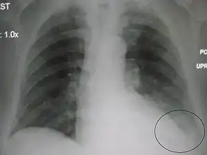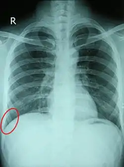 ![]() Chest X-ray of a 30-year-old healthy man, with the costodiaphragmatic recess label in red ellipse | |