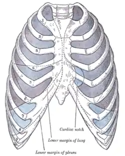 The costodiaphragmatic recess, also called the costophrenic recess or phrenicocostal sinus,[1] is the posterolateral fringe of the pleural space, a potential space around the lung inside the pleural cavity. It is located at the acutely angled junction ("reflection") between the costal and diaphragmatic pleurae, and is interpreted two-dimensionally on plain X-rays as the costophrenic angle. It measures approximately 5 cm (2.0 in) vertically and extends from the eighth to the tenth rib along the mid-axillary line.