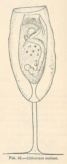 Cothurnia and other peritrichs were among the first microbes observed by Antoine van Leeuwenhoek upon the invention of his microscope in the 17th century. His observation of Cothurnia, Coleps and Vorticella under the microscope led to the publication of their illustrations in 1702.[8] The name Cothurnia was coined two centuries later by Christian Gottfried Ehrenberg to distinguish loricate peritrichs with stalks (Cothurnia) from those without stalks (Vaginicola). Further studies of the genus led to the establishment of Cothurnia imberbis as the type species in 1831.[9] Ehrenberg illustrated C.imberbis Ehrenberg in his 1838 book called Die Infusionsthierchen als Vollkomene Organismen.[10] However, Jankowski noted that C.imberbis was not desirable to be a type species because it was understudied and difficult to do so; apparently unaware of Bacon's extensive study of it. In Ehrenberg's 1839 publication with Louis Mandl entitled Traité pratique du microscope et de son emploi dans l'étude des corps organisés, they provided the definite description of Cothurnia.[11]