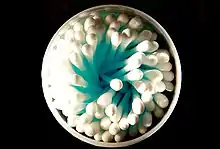 Cotton swabs (American English) or cotton buds (British English) are handheld items that consist of one or two small wads of cotton wrapped around one or both ends of a short rod made of wood, rolled paper, or plastic. They are most commonly used for ear cleaning, although this use is not recommended by physicians. Other uses include first aid, cosmetics application, cleaning, and arts and crafts. Some countries have banned the plastic-stemmed versions in favor of biodegradable alternatives over concerns about marine pollution.