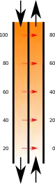 Two tubes have a liquid flowing in the same direction. One starts off hot at 60 °C, the second cold at 20 °C. A thermoconductive membrane or an open section allows heat transfer between the two flows.