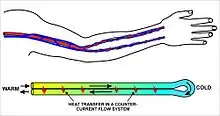 In cold weather the blood flow to the limbs of birds and mammals is reduced on exposure to cold environmental conditions, and returned to the trunk via the deep veins which lie alongside the arteries (forming venae comitantes).[19][20][21] This acts as a counter-current exchange system which short-circuits the warmth from the arterial blood directly into the venous blood returning into the trunk, causing minimal heat loss from the extremities in cold weather.[18][19] The subcutaneous limb veins are tightly constricted, thereby reducing heat loss via this route, and forcing the blood returning from the extremities into the counter-current blood flow systems in the centers of the limbs. Birds and mammals that regularly immerse their limbs in cold or icy water have particularly well developed counter-current blood flow systems to their limbs, allowing prolonged exposure of the extremities to the cold without significant loss of body heat, even when the limbs are as thin as the lower legs, or tarsi, of a bird, for instance.[20]