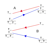 Two tubes have a liquid flowing in opposite directions, transferring a property from one tube to the other. For example, this could be transferring heat from a hot flow of liquid to a cold one, or transferring the concentration of a dissolved solute from a high concentration flow of liquid to a low concentration flow.