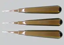 Coupland’s elevators (also known as chisels) [1][2] are instruments commonly used for dental extraction. They are used in sets of three each of increasing size and are used to split multi-rooted teeth and are inserted between the bone and tooth roots and rotated to elevate them out of the sockets.[3] The instruments were designed by Doctor Douglas C W Coupland who qualified as a Dental Surgeon in Toronto in 1922 and spent most of his career practising dentistry in Ottawa where he specialised in dental extraction.[4] Coupland designed the instruments in the 1920s; they were manufactured by the Hu-Friedy company and sold from the early 1930s initially as sets of eight or twelve which were later reduced to three.[2] Coupland also designed a set of dental suckers with interchangeable tips.[2] He died in 1936 after only 13 years of clinical practice.[2]