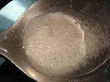Crack cocaine is frequently purchased already in rock form,[3] although it is not uncommon for some users to "wash up" or "cook" powder cocaine into crack themselves. This process is frequently done with baking soda (sodium bicarbonate), water, and a spoon. Once mixed and heated, the bicarbonate reacts with the hydrochloride of the powder cocaine, forming free base cocaine and carbonic acid (H2CO3) in a reversible acid-base reaction. The heating accelerates the degradation of carbonic acid into carbon dioxide (CO2) and water. Loss of CO2 prevents the reaction from reversing back to cocaine hydrochloride. Free base cocaine separates as an oily layer, floating on the top of the now leftover aqueous phase. It is at this point that the oil is picked up rapidly, usually with a pin or long thin object. This pulls the oil up and spins it, allowing air to set and dry the oil, and allows the maker to roll the oil into the rock-like shape.