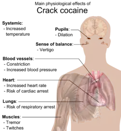 The short-term physiological effects of cocaine include[10] constricted blood vessels, dilated pupils, and increased temperature, heart rate, and blood pressure. Some users of cocaine report feelings of restlessness, irritability, and anxiety. In rare instances, sudden death can occur on the first use of cocaine or unexpectedly thereafter.[10] Cocaine-related deaths are often a result of cardiac arrest or seizures followed by respiratory arrest.