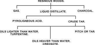 The information that follows describing the other various types of creosote materials and its uses should be considered as primarily being of only historical value. This history is important, because it traces the origin of these different materials used during the 19th and early 20th centuries. Furthermore, it must be considered that these other types of creosotes – lignite-tar, wood-tar, water-gas-tar, etc. – are not currently being manufactured and have either been replaced with more economical materials, or replaced by products that are more efficacious or safer.