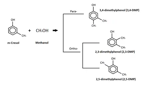 The diagram above depicts a reaction between m-cresol and methanol where a c-alkylation product is produced.[88] The c-alkylation reaction means that instead of replacing the hydrogen atom on the -OH group, the methyl group (from the methanol) replaces the hydrogen on a carbon in the benzene ring.[88] The products of this c-alkylation can be in either a para- or ortho- orientation on the molecule, as seen in the diagram, and water, which is not shown.[88] Isomers of the dimethylphenol (DMP) compound are the products of the para- and ortho-c-alkylation.[88] Dimethylphenol (DMP) compound is listed as an aquatic hazard by characteristic, and is toxic with long lasting effects.[90]