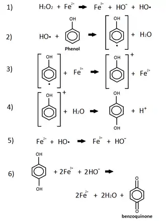 This reaction shows the oxidation of phenol by iron and peroxide.[105] This combination of iron, which comes from iron oxide in the sediment, and the peroxide, commonly released by animals and plants into the environment, is known as the Fenton Reagent. [105] This reagent is used to oxidize phenol groups by the use of a radical hydroxide group produced from the peroxide in the p-benzoquinone.[105] This product of phenol's oxidation is now leached into the environment while other products include iron(II) and water. P-benzoquinone is listed as being a very toxic, acute environmental hazard.[106]