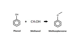 This diagram shows an o-alkylation between phenol and methanol. Unlike the c-alkylation, the o-alkylation replaces the hydrogen atom on the -OH group with the methyl group (from the methanol).[91] The product of the o-alkylation is methoxybenzene, better known as anisole, and water, which is not shown in the diagram.[91] Anisole is listed as an acute hazard to aquatic life with long term effects.[92]