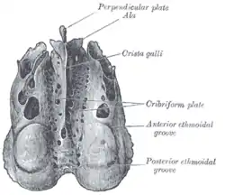 The crista galli (Latin: "crest of the rooster") is the upper part of the perpendicular plate of the ethmoid bone,[1] which rises above the cribriform plate. The falx cerebri (fold of the dura mater) attaches to the crista galli.