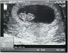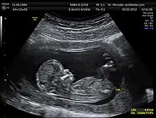 Crown rump length before a gestational age of 9 weeks is extrapolated by assuming a crown rump length of 0 at a gestational age of 2 weeks, corresponding to an embryonic age of 0 weeks. This extrapolated part is blurred because of uncertain values. - Verburg BO, Steegers EA, De Ridder M, Snijders RJ, Smith E, Hofman A, et al. (April 2008). "New charts for ultrasound dating of pregnancy and assessment of fetal growth: longitudinal data from a population-based cohort study". Ultrasound in Obstetrics & Gynecology. 31 (4): 388–96. doi:10.1002/uog.5225. PMID 18348183. S2CID 349860.