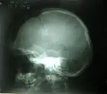 Gorham disease is a condition that targets the human musculoskeletal system including the crown of the skull. The chronic disorder involves the progressive loss of bone, although, symptoms such as intense pain are not evident during the initial stages.[22] The cause of the Gorham disease has not been discovered, however, cells associated with the breakdown of fragile and old bones which include osteoclasts are considered to be the main link towards identifying the cause. The symptoms of the disease are clear after a fracture to the crown of the skull causing patients to experience abnormal deformities as well as issues to the nervous system.[23] Diagnosis occurs through physical exams such as X-rays and magnetic resonance imaging which find the decrease in bone mass (osteolysis) and deformities. Treatment of the disease involves a range of techniques to prevent spread from the skull to the spine or chest of the patient. Chemotherapy and surgery, as well as lifestyle changes such as consuming a diet of high protein, aim to minimise the severity of the disease.[24]