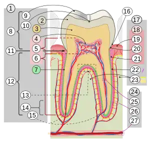 1. Tooth 2. Enamel 3. Dentin 4. Dental pulp ::5. cameral pulp ::6. root pulp :7. Cementum :8. Crown ::9. Cusp ::10. Sulcus :11. Neck :12. Root ::13. Furcation ::14. Root apex :::15. Apical foramen 16. Gingival sulcus