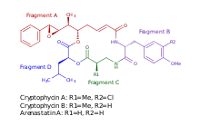 Cryptophycins were originally discovered in 1990 in cyanobacteria of the genus Nostoc.[1] Cryptophycins were patented as antifungal agents with an unknown mechanism of action and subsequently identified as microtubule inhibitors.[2] Closely related molecules were reported in the marine sponge Dysidea arenaria, which were first given the name arenastatins.[3] However, since cyanobacteria are common symbionts of sponges, it has been suggested that bacteria may be the true origin in cases where sponge and bacterial metabolites closely resemble one another.[4] Nevertheless, study of the structure-activity relationships between the two subgroups of molecules led to improved understanding of their cytotoxic effects.[5]:230