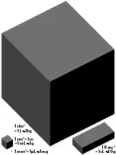 ![]() A measuring cup holding 1000 cubic centimetres, that is one litre (1 L) or 1000 millilitres (1000 mL) | |