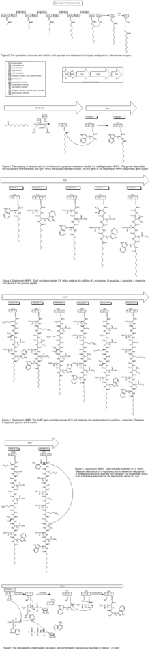 The NRPS responsible for the synthesis of daptomycin is encoded by three overlapping genes, dptA, dptBC and dptD. The dptE and dptF genes, immediately upstream of dptA, are likely to be involved in the initiation of daptomycin biosynthesis by coupling decanoic acid to the N-terminal Trp.[29] These novel genes (dptE, dptF ) correspond to products that most likely work in conjunction with a unique condensation domain to acylate the first amino acid (tryptophan). These and other novel genes (dptI, dptJ) are believed to be involved in supplying the nonproteinogenic amino acids L-3-methylglutamic acid and Kyn; they are located next to the NRPS genes.[29]