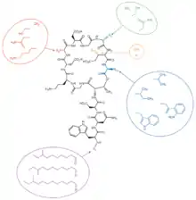 Daptomycin is a cyclic lipopeptide antibiotic produced by Streptomyces roseosporus.[27][28] Daptomycin consists of 13 amino acids, 10 of which are arranged in a cyclic fashion, and three on an exocyclic tail. Two nonproteinogenic amino acids exist in the drug, the unusual amino acid L-kynurenine (Kyn), only known to daptomycin, and L-3-methylglutamic acid (mGlu). The N-terminus of the exocyclic tryptophan residue is coupled to decanoic acid, a medium-chain (C10) fatty acid. Biosynthesis is initiated by the coupling of decanoic acid to the N-terminal tryptophan, followed by the coupling of the remaining amino acids by nonribosomal peptide synthetase (NRPS) mechanisms. Finally, a cyclization event occurs, which is catalyzed by a thioesterase enzyme, and subsequent release of the lipopeptide is granted.